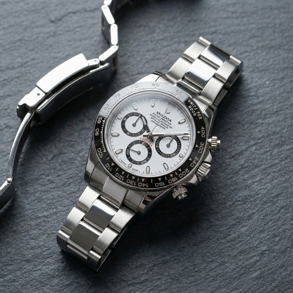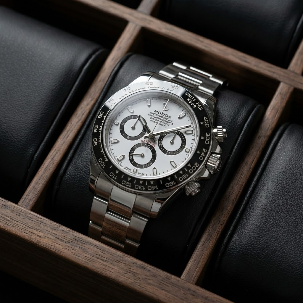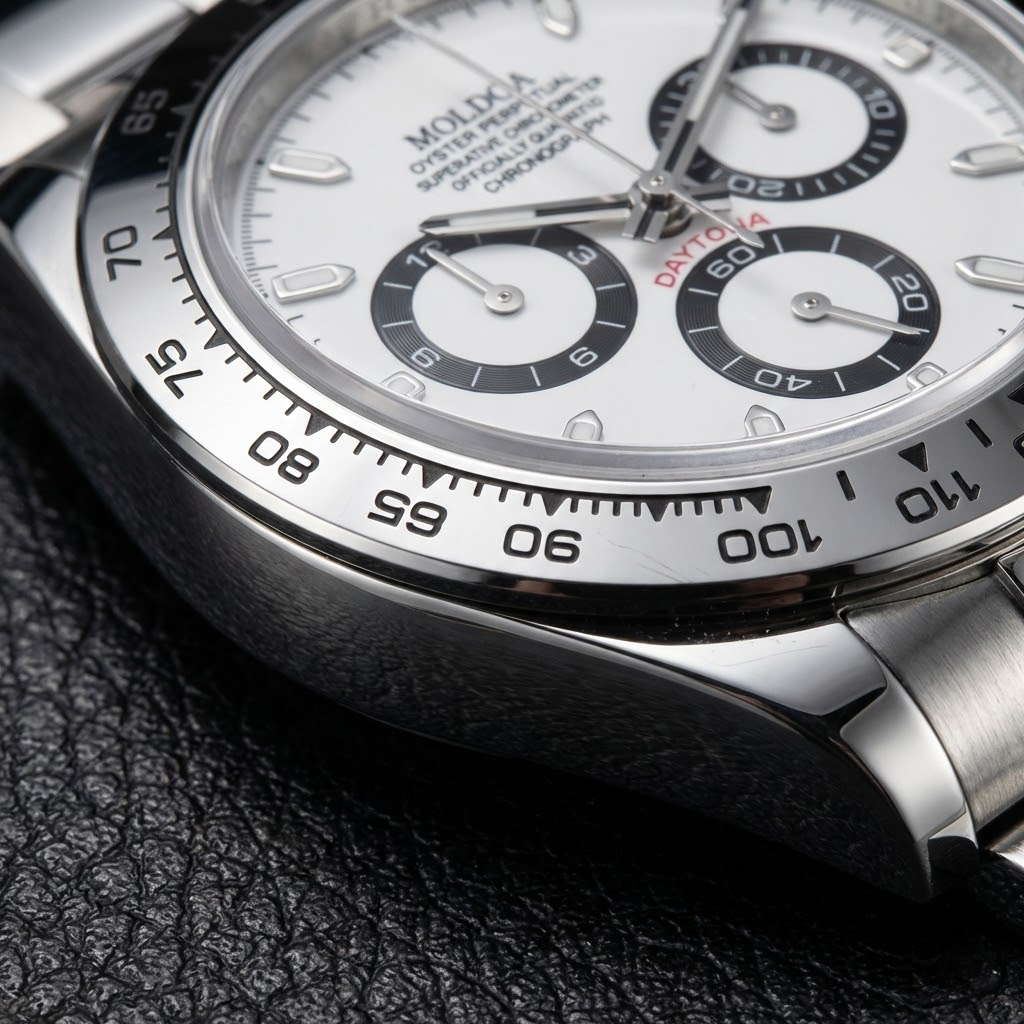 The Corsa is defined by a high-contrast “Panda” dial specified for legibility and visual balance. The sunburst finish and disciplined sub-dial layout deliver a technical aesthetic with a refined, curated presence.