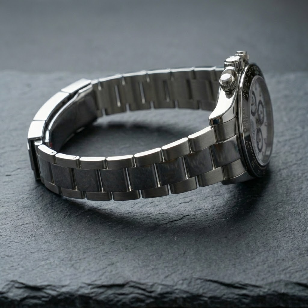 We prioritise material choices that sustain appearance over time. Polished 316L stainless steel and a solid-link bracelet are selected to provide consistent structure, weight, and finishing.